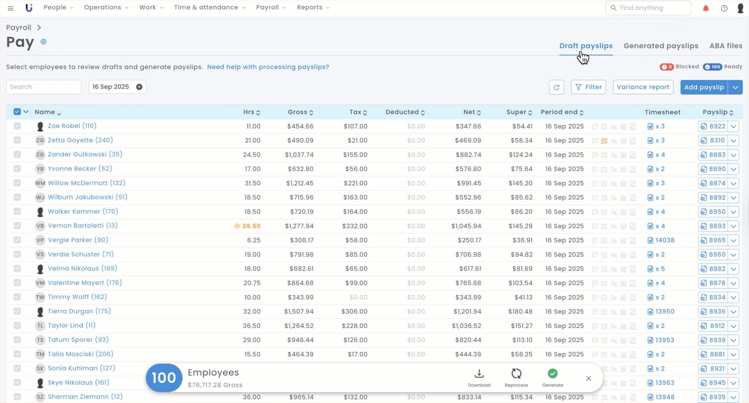 - View and compare All payslips (Draft and Generated) from your pay period selected to All payslips from an earlier date.