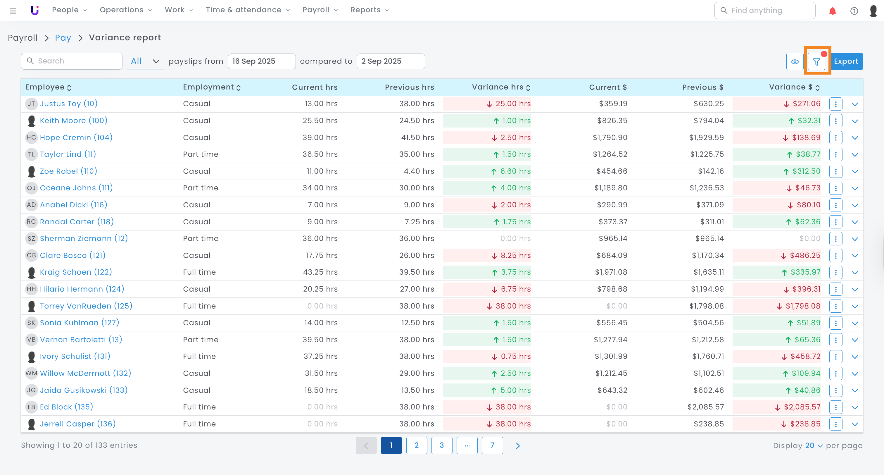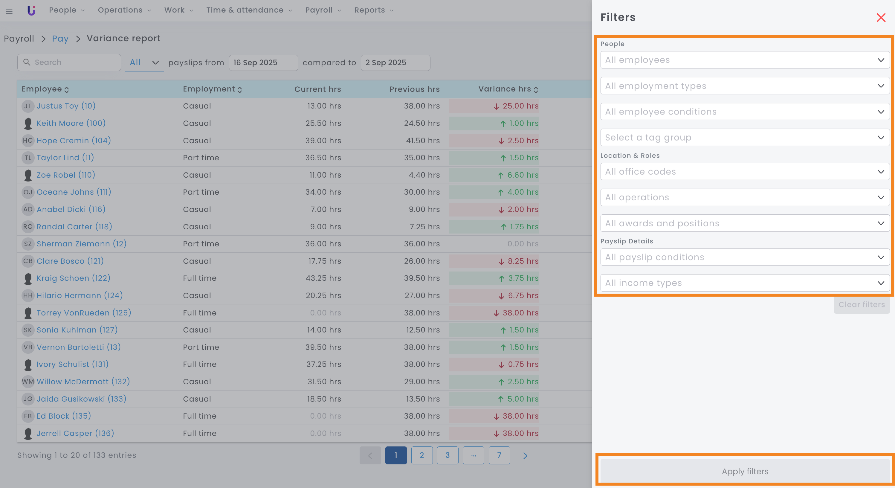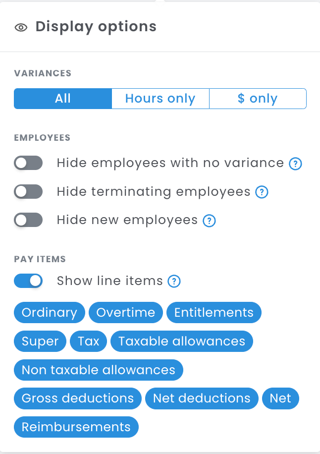 - Hide terminating employees - This option will hide employees with the terminating pill against them. As they terminate, they will likely have a more significant variation due to potential leave payouts.