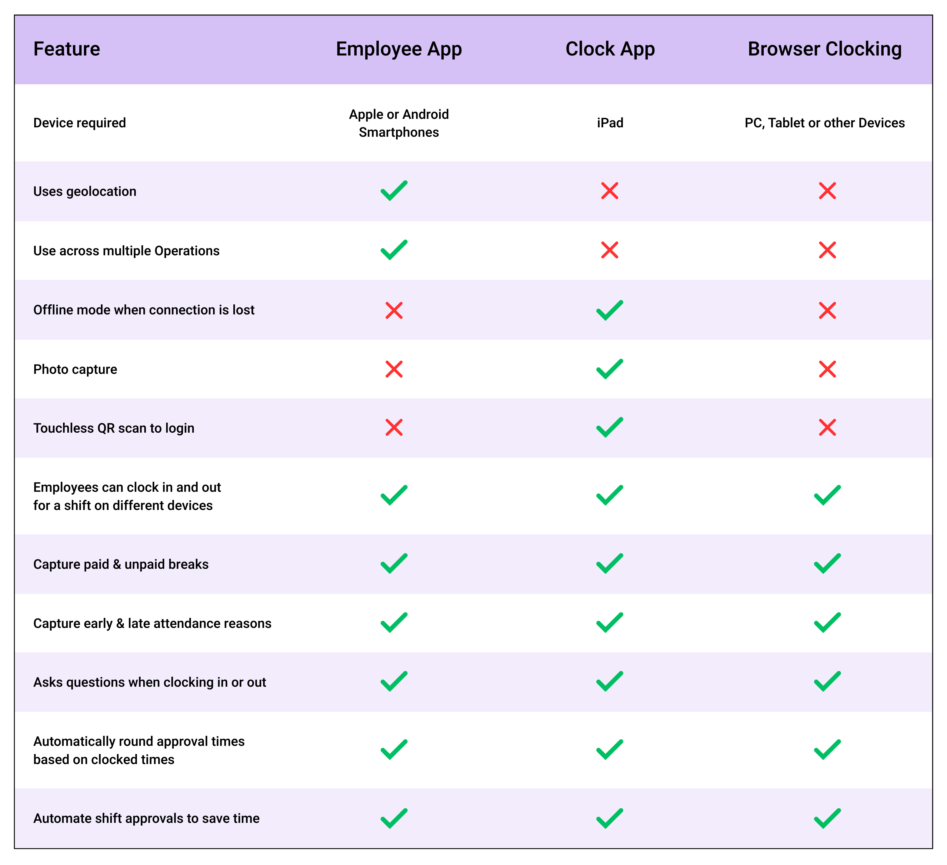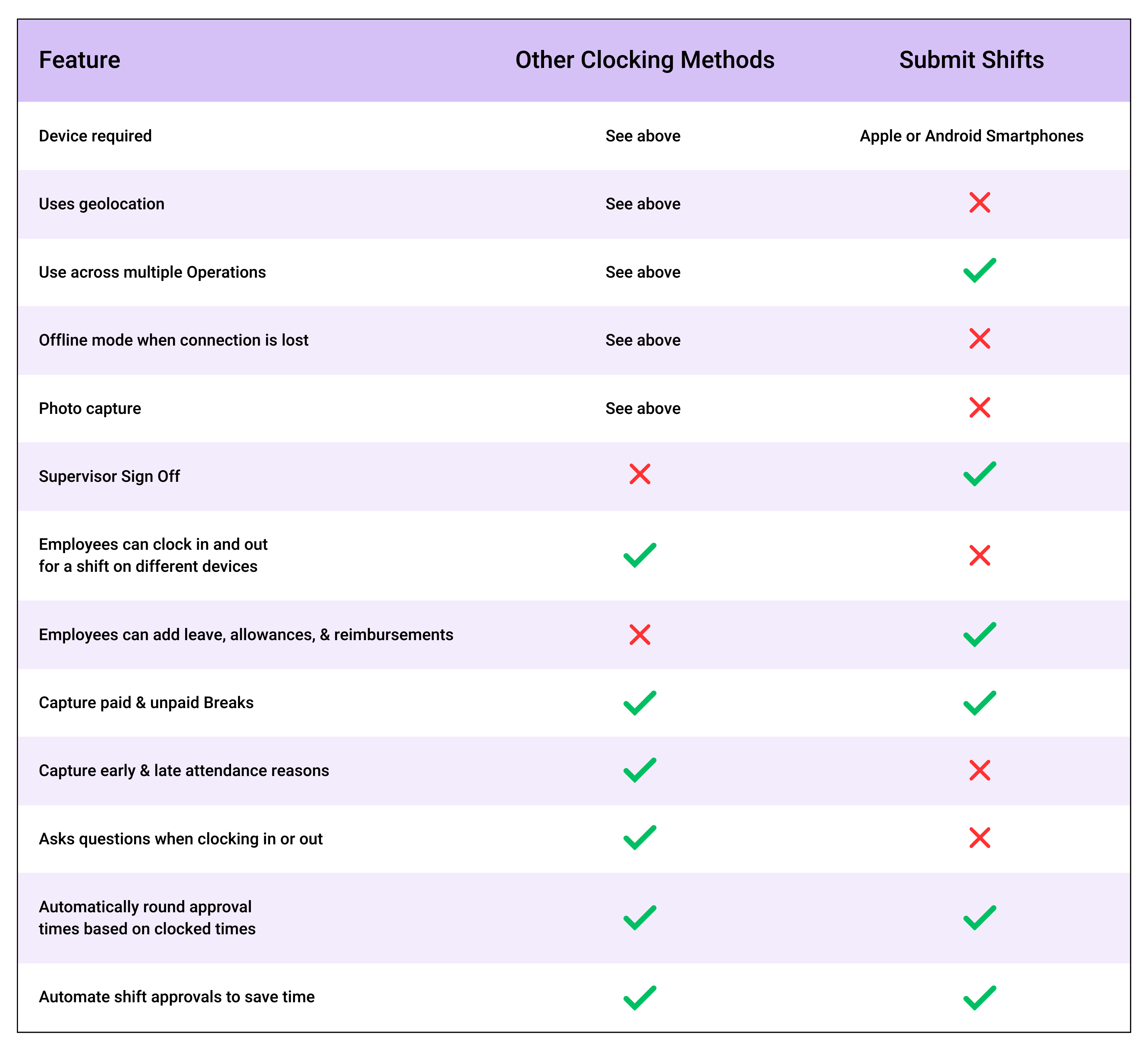 Refer to the image below, which compares the key features and benefits of using Submit Shifts with those of the other clocking methods.