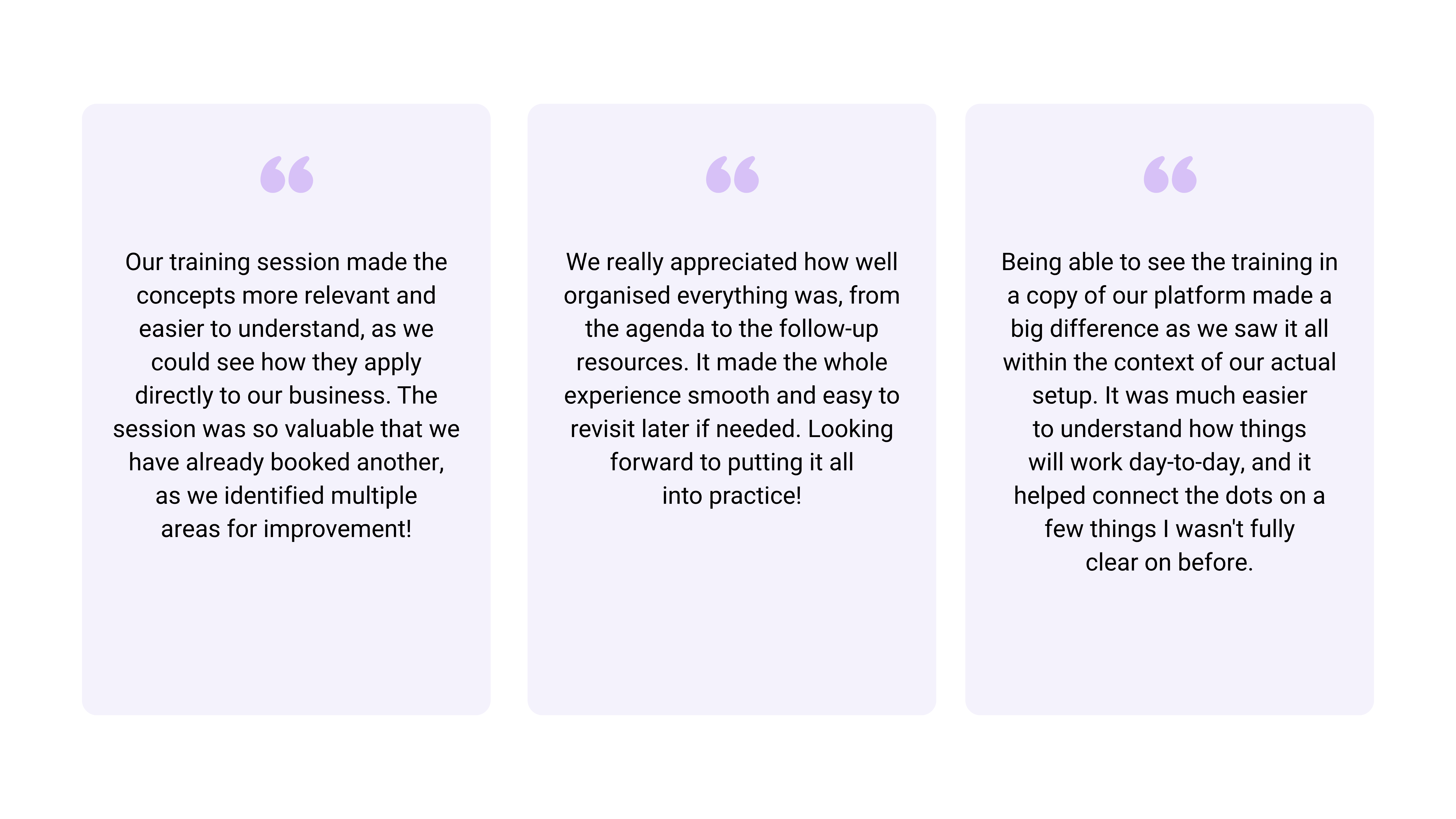 Customised training allows you to select the topics you want covered, view the training demos within a copy of your platform data, and customise the sessions based on the permission levels of your admins in attendance.