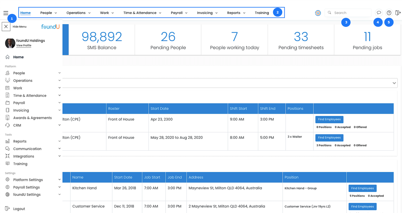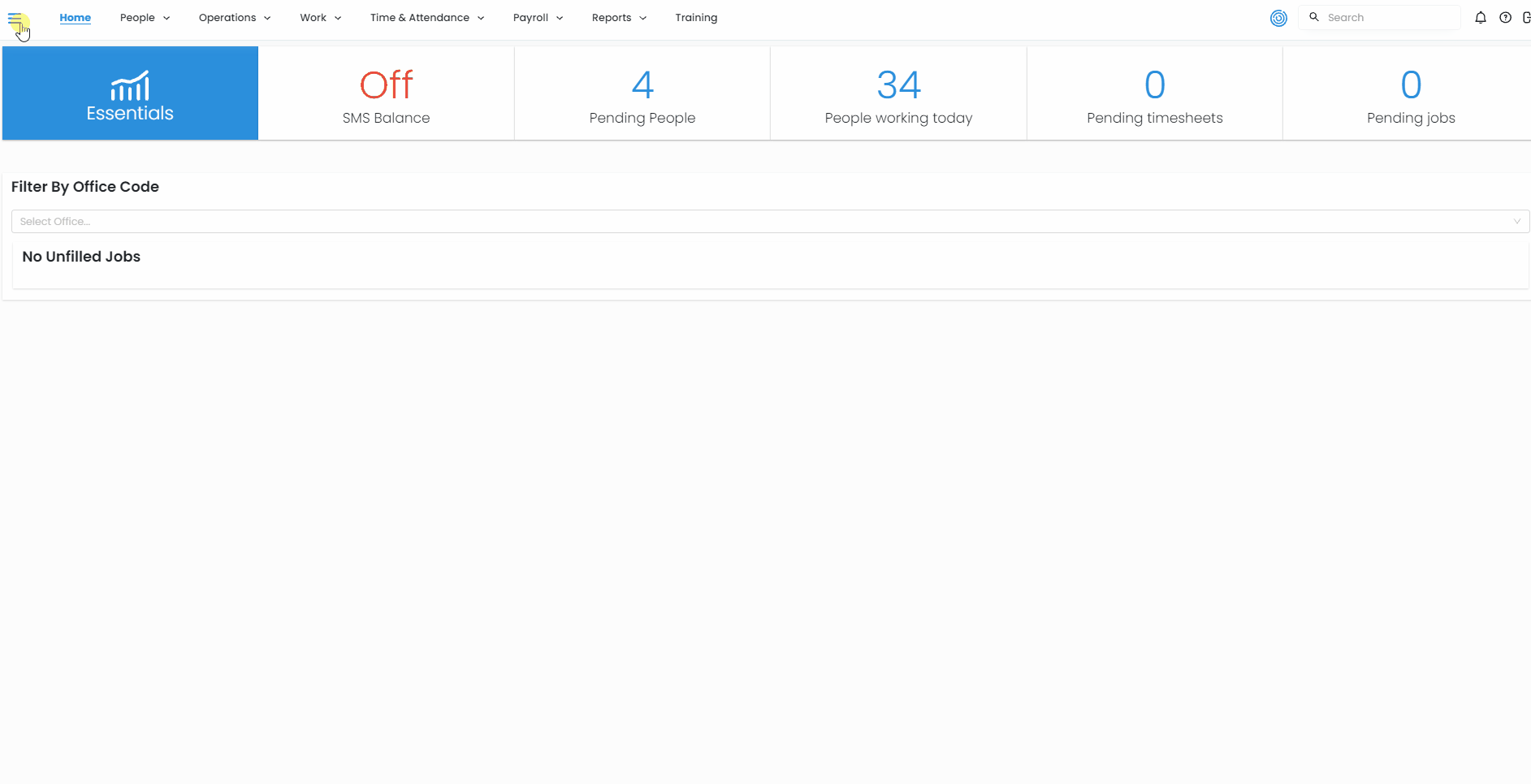 - Use the 'Quick Menus' for your daily activity. Your menu may have less options depending on your user permissions. For example a Roster Manager may not see the Payroll and Invoicing menus.
