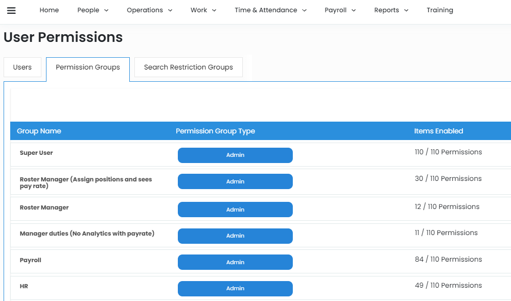- There is a Super Admin set up with all the permission and then varying groups of Admins e.g. HR, Payroll etc).