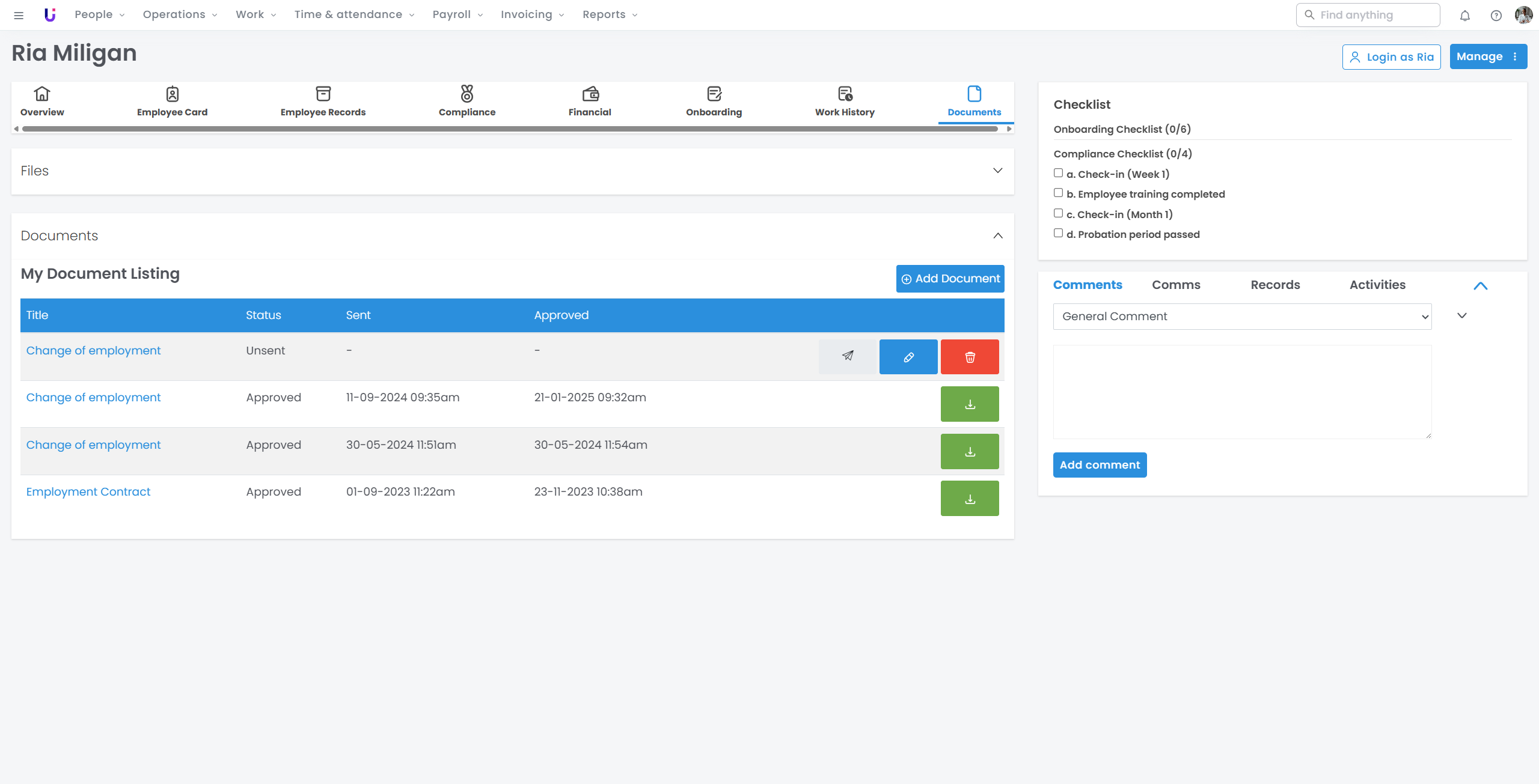 - Sending a document to an employee through the Employee Profile. The employee signs, acknowledges it, and sends it back.