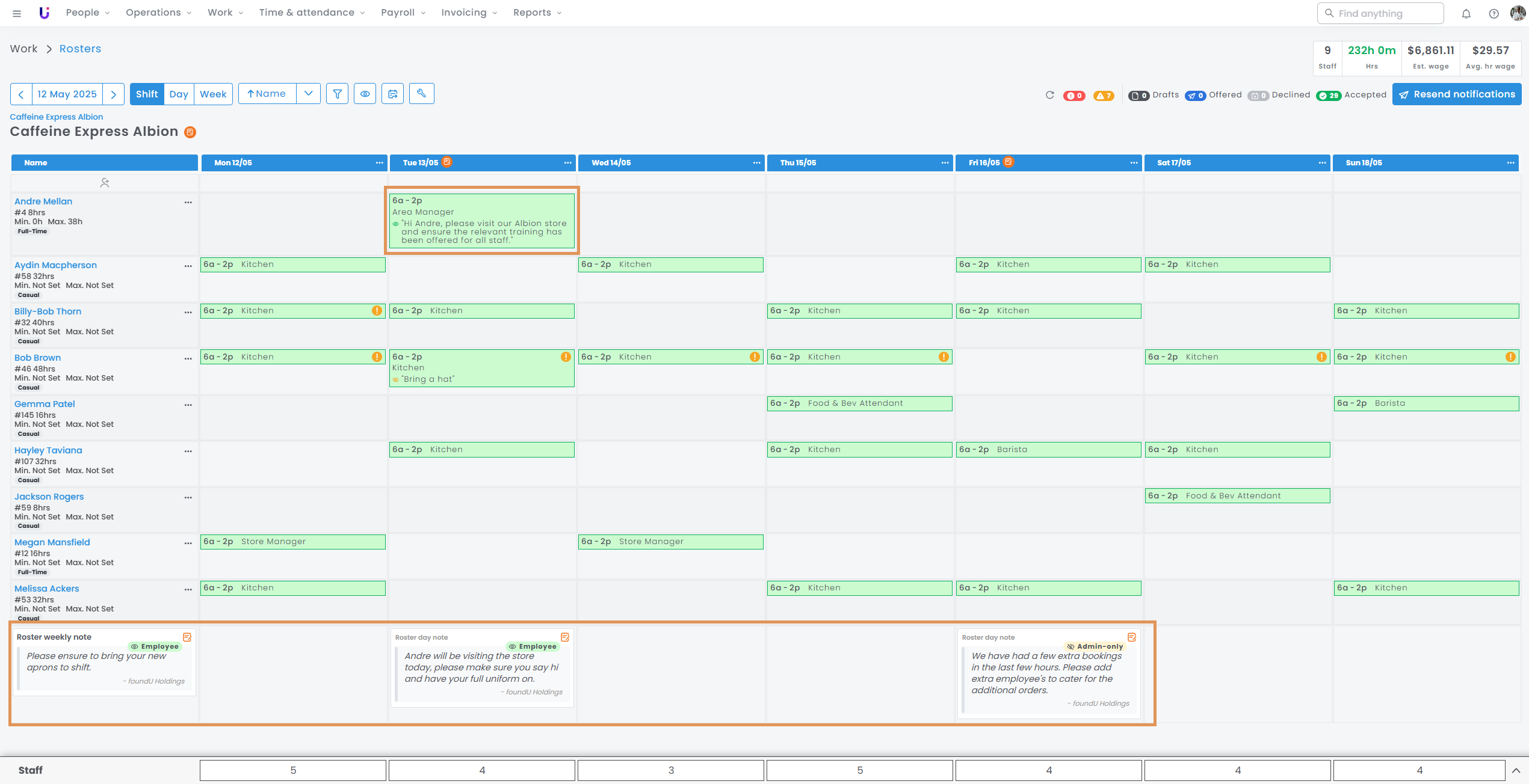 One of the features users value in our roster is the ability to communicate with employees via various roster note types. You can add roster notes for the entire week, for individual days, or even for specific shifts for each employee.