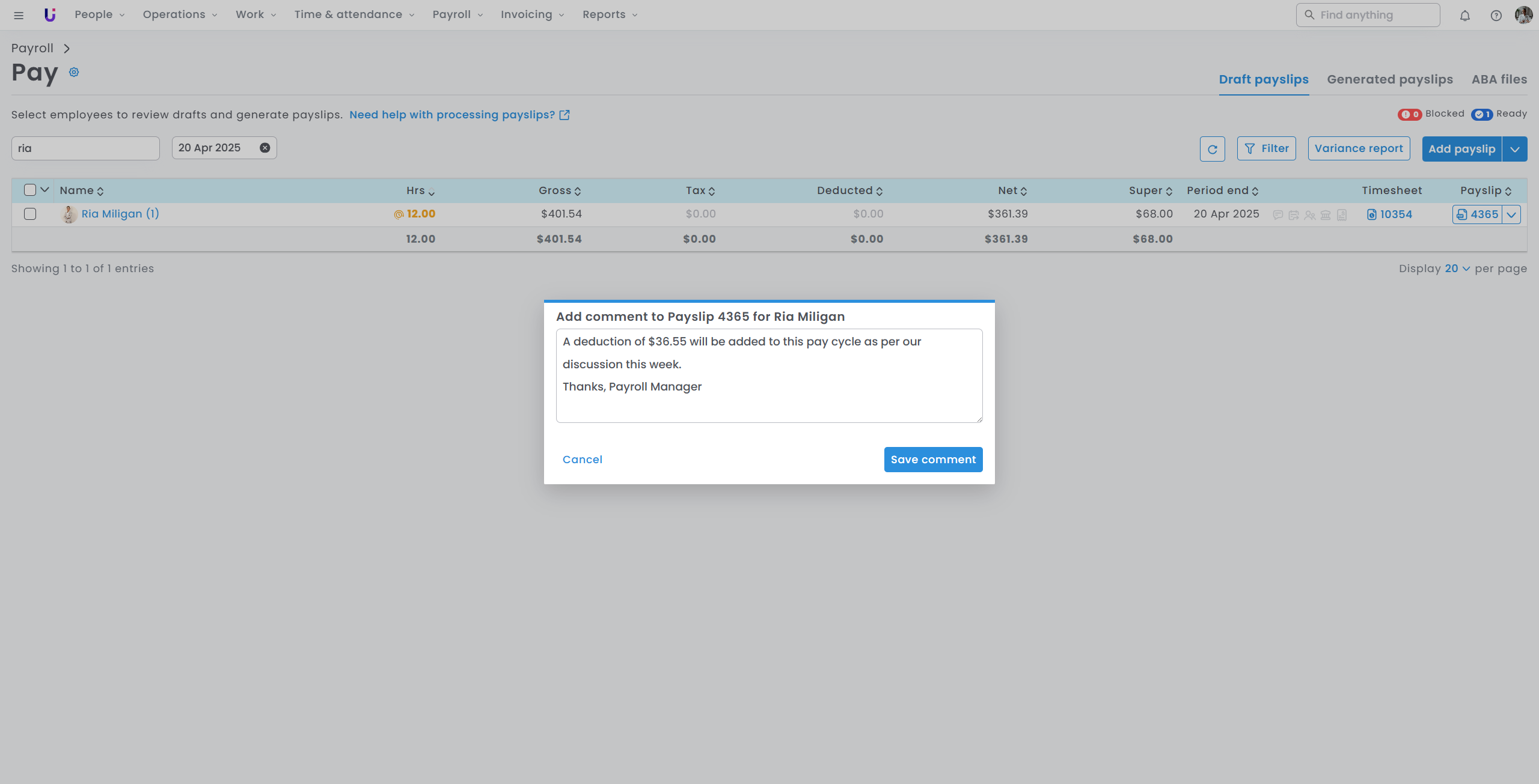 Adding a comment to an employee's payslip is a simple and effective way to explain any changes made to their pay.