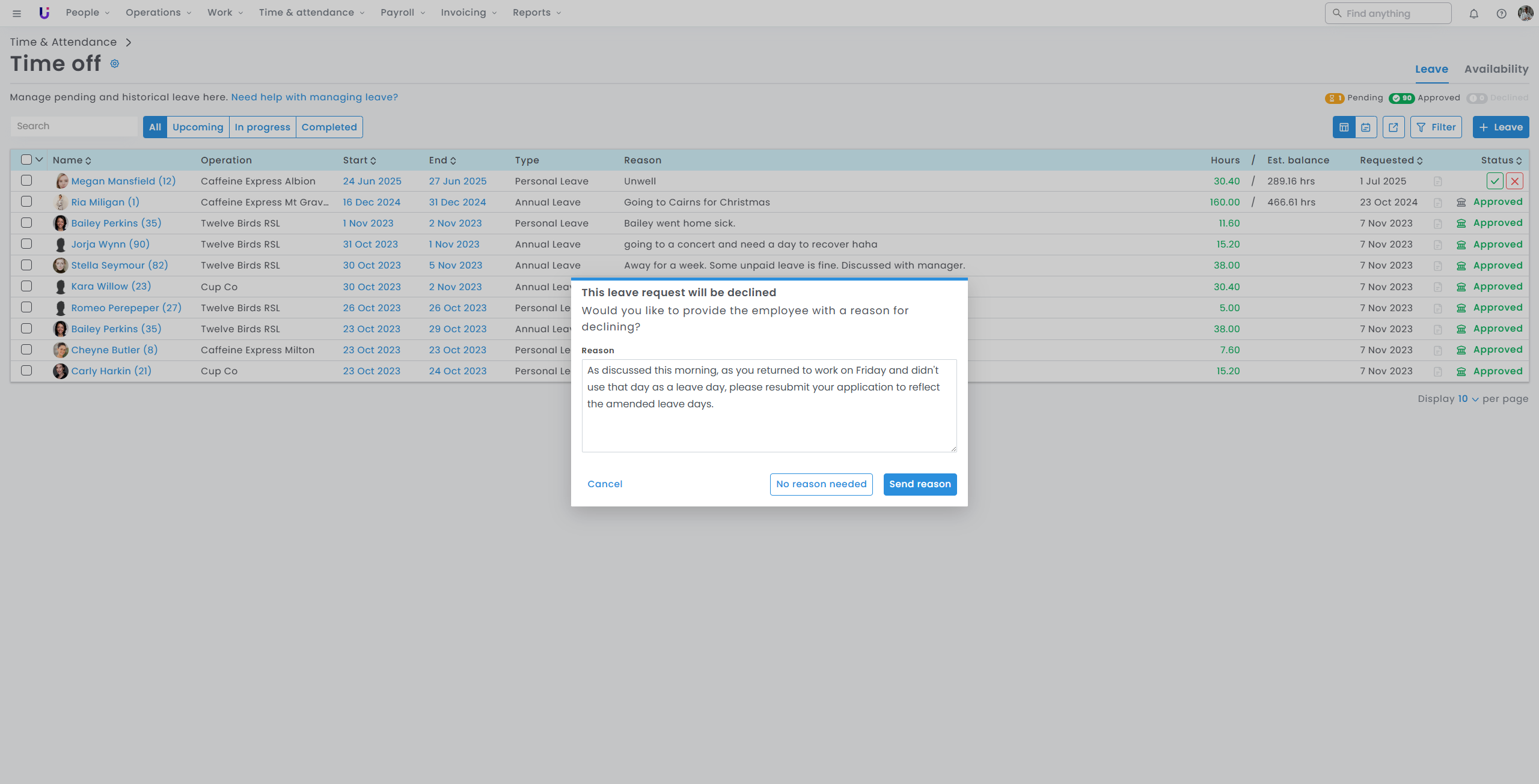 When managing Time Off, if you decline an employee's leave application, you may optionally provide a reason that will be sent to the employee.