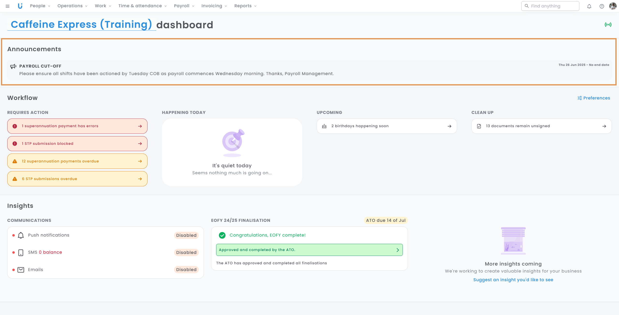 - This announcement is particularly useful for providing key information to those managing staff in your business.