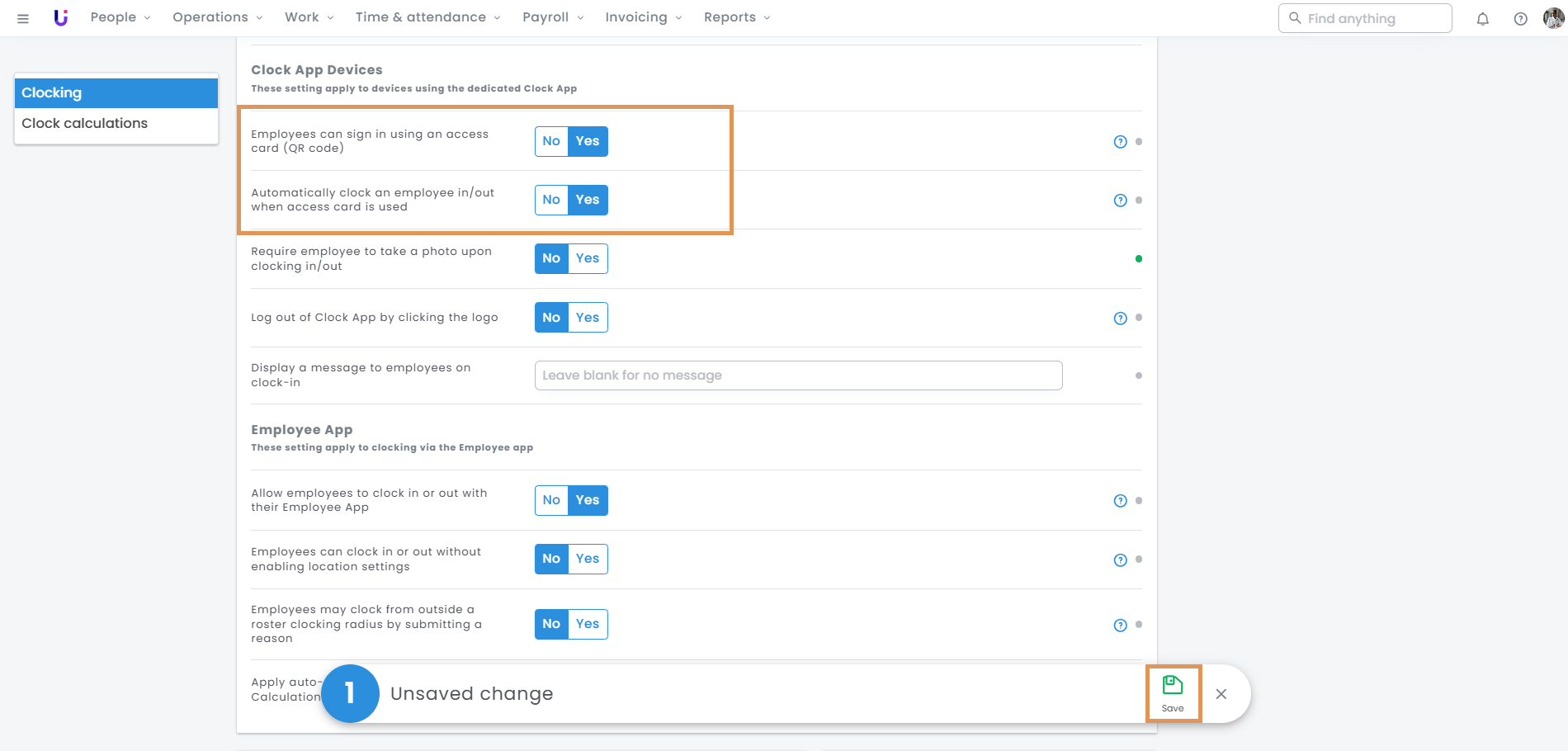- From the Clocking section > Clock App Devices, enable the 'Employees can sign in using an access card (QR code)' setting.
