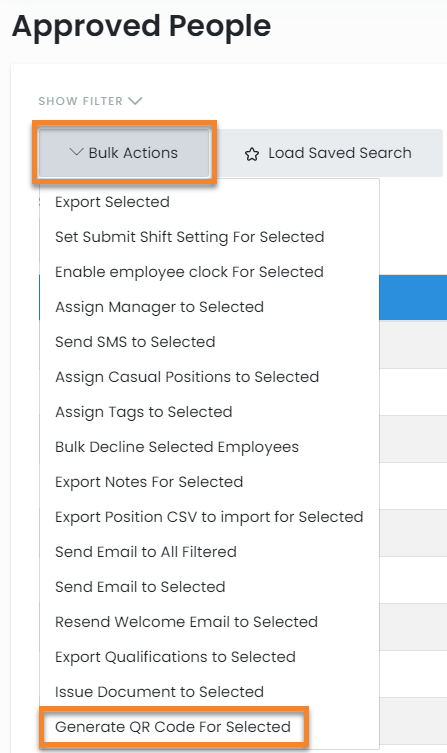 - After you have filtered/selected the relevant employees, select Bulk Actions > Generate QR Code for Selected.