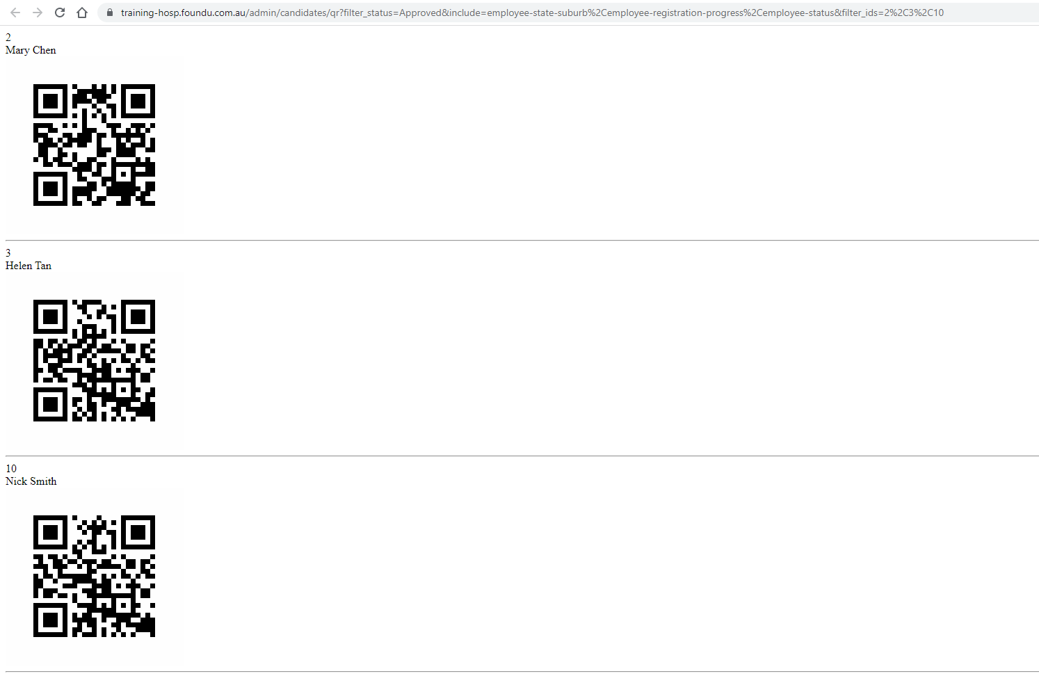 - The QR codes for the relevant employees will display in a new tab in your browser, allowing you to screenshot or print them to provide to your employees.