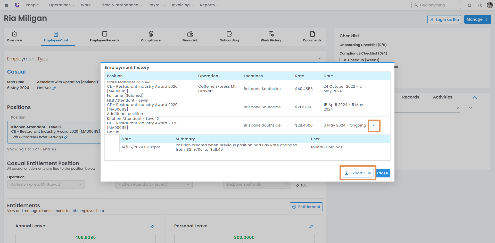 Hot tip: You can also export the employee's employment history by selecting Export CSV.