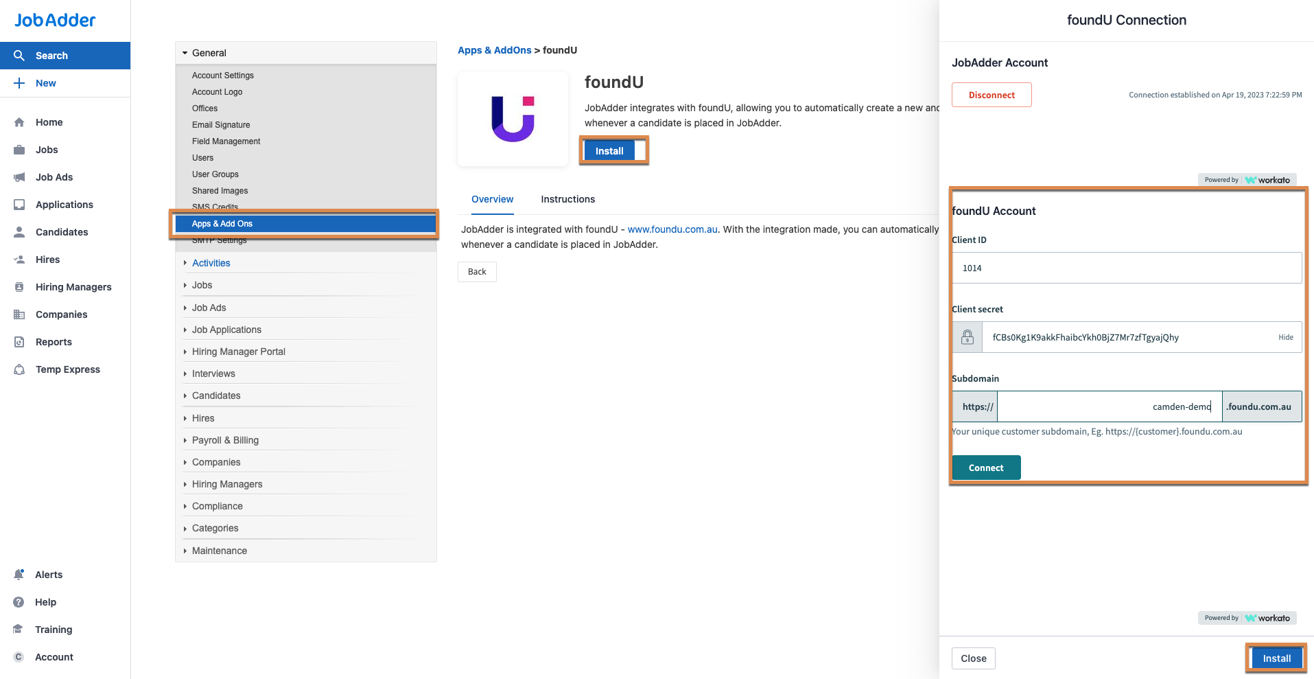 - Once authorised, you will be taken back to JobAdder where the foundU button will now show as connected. Select the Install button to finalise the process.