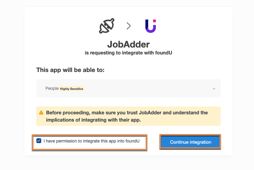 - On the authorisation screen, confirm your permission to connect foundU and JobAdder and Continue Integration.